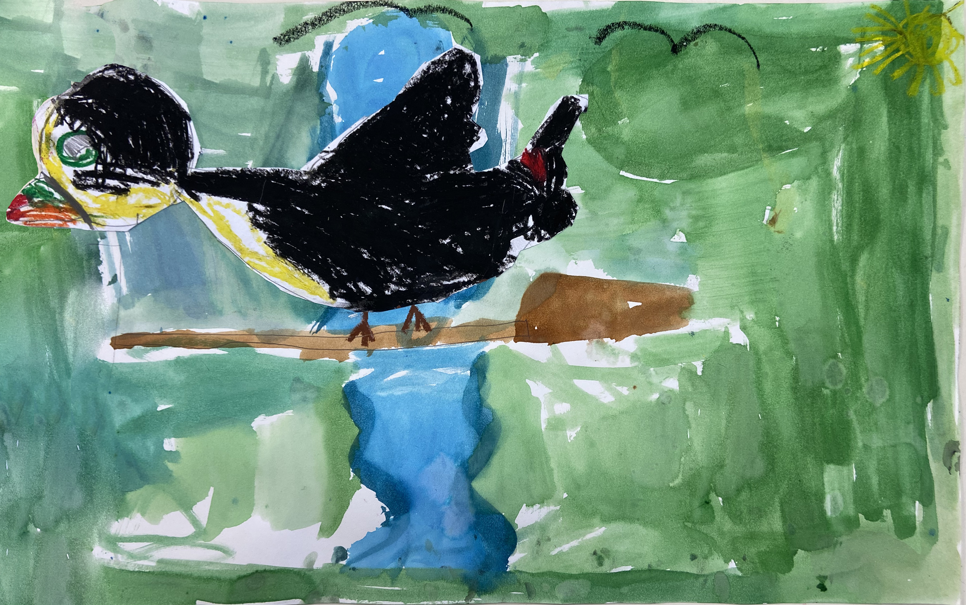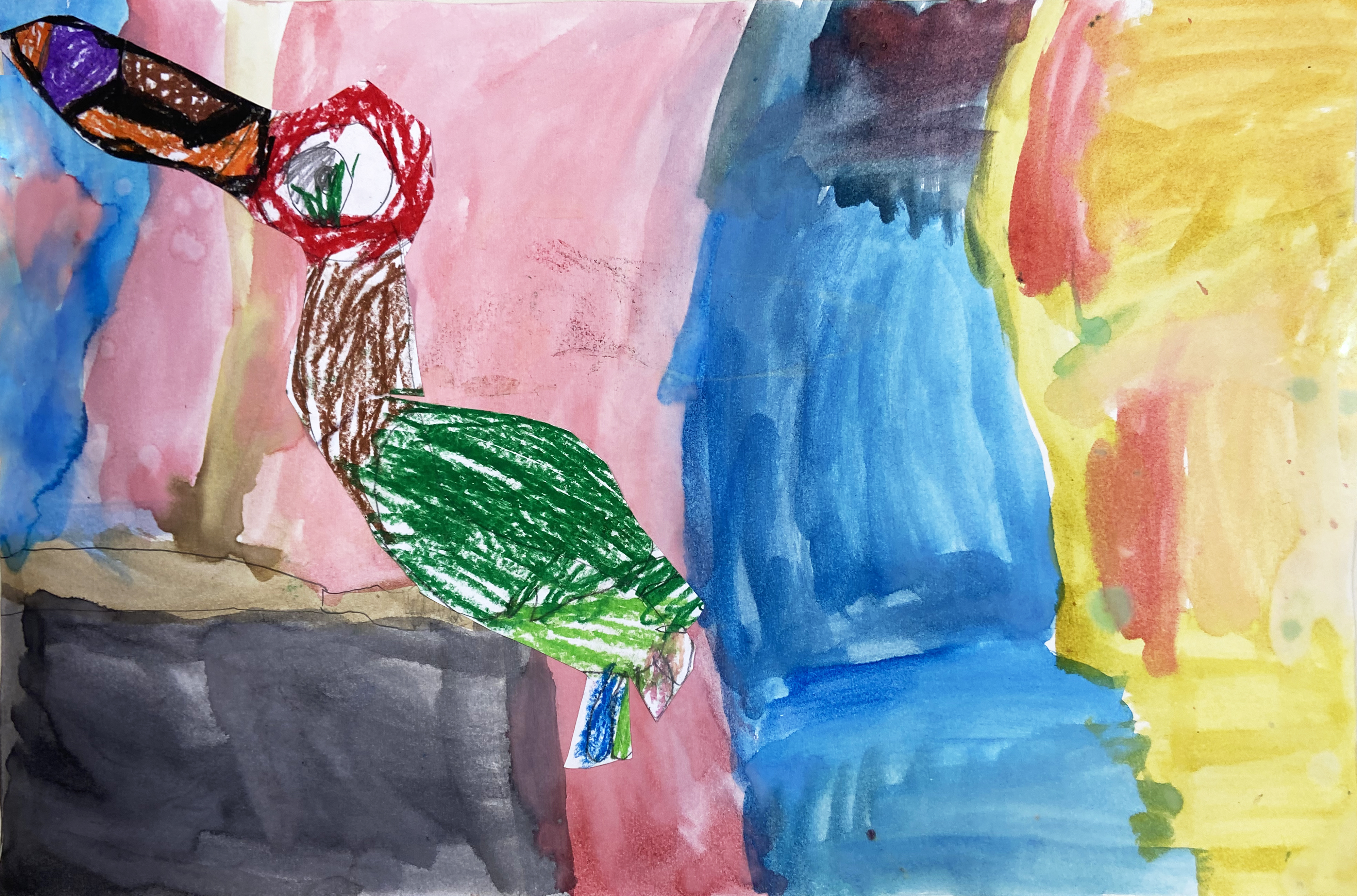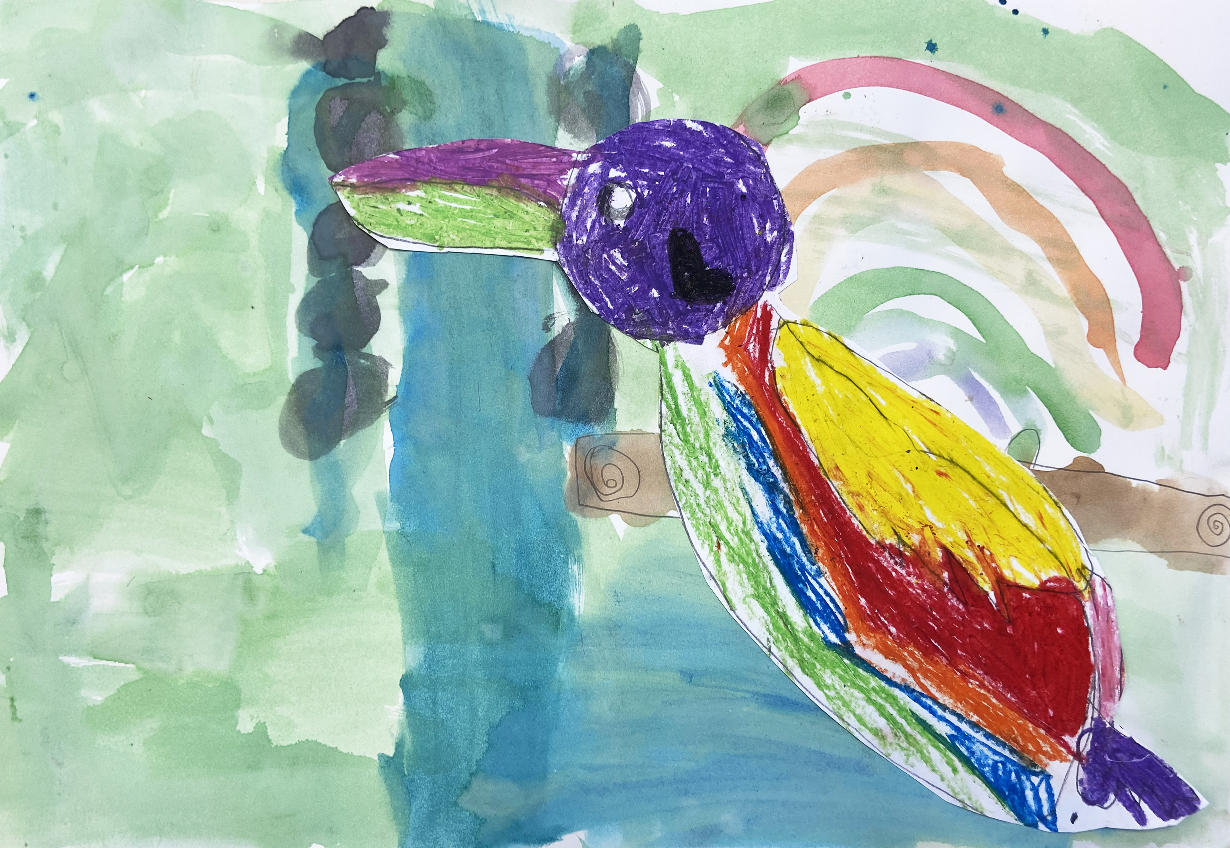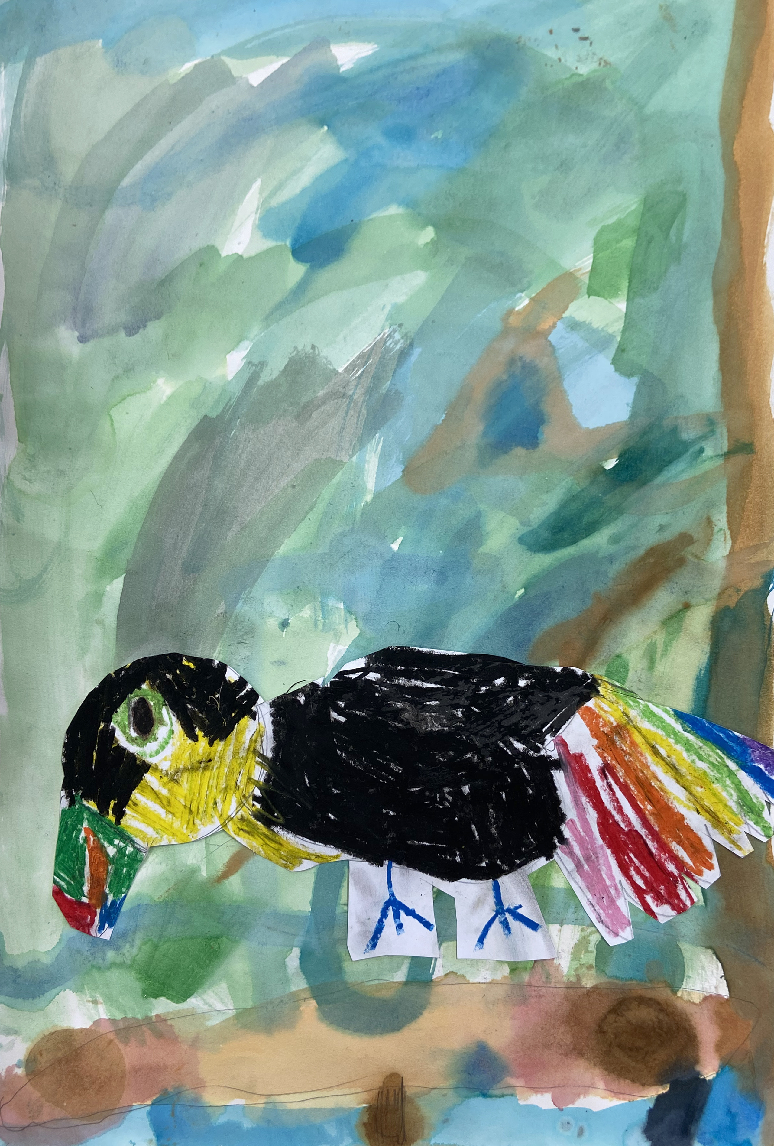 Using watercolor and oil pastels, students created unique toucans, perching in a rainforest of their own imagination. In this two step process, students were assisted in a guided drawing, with photo references for color.