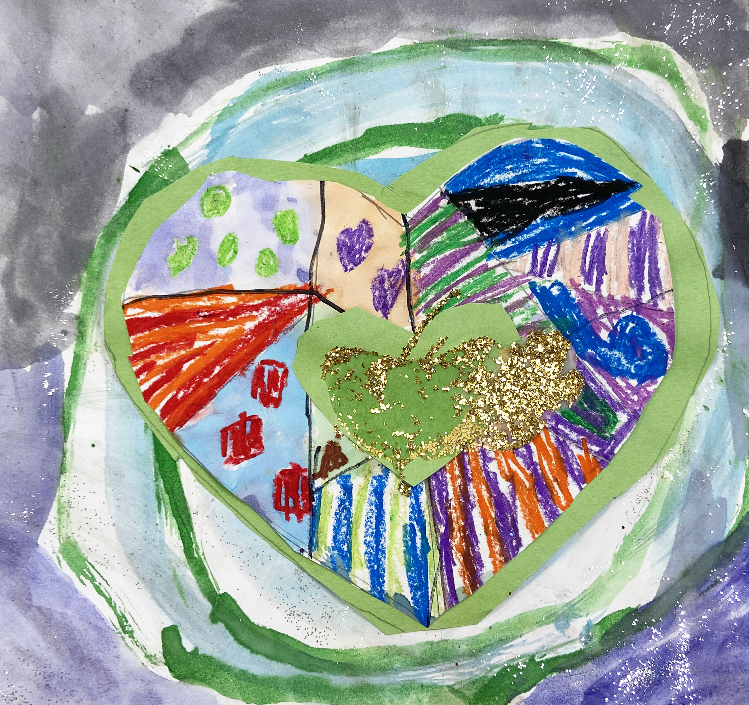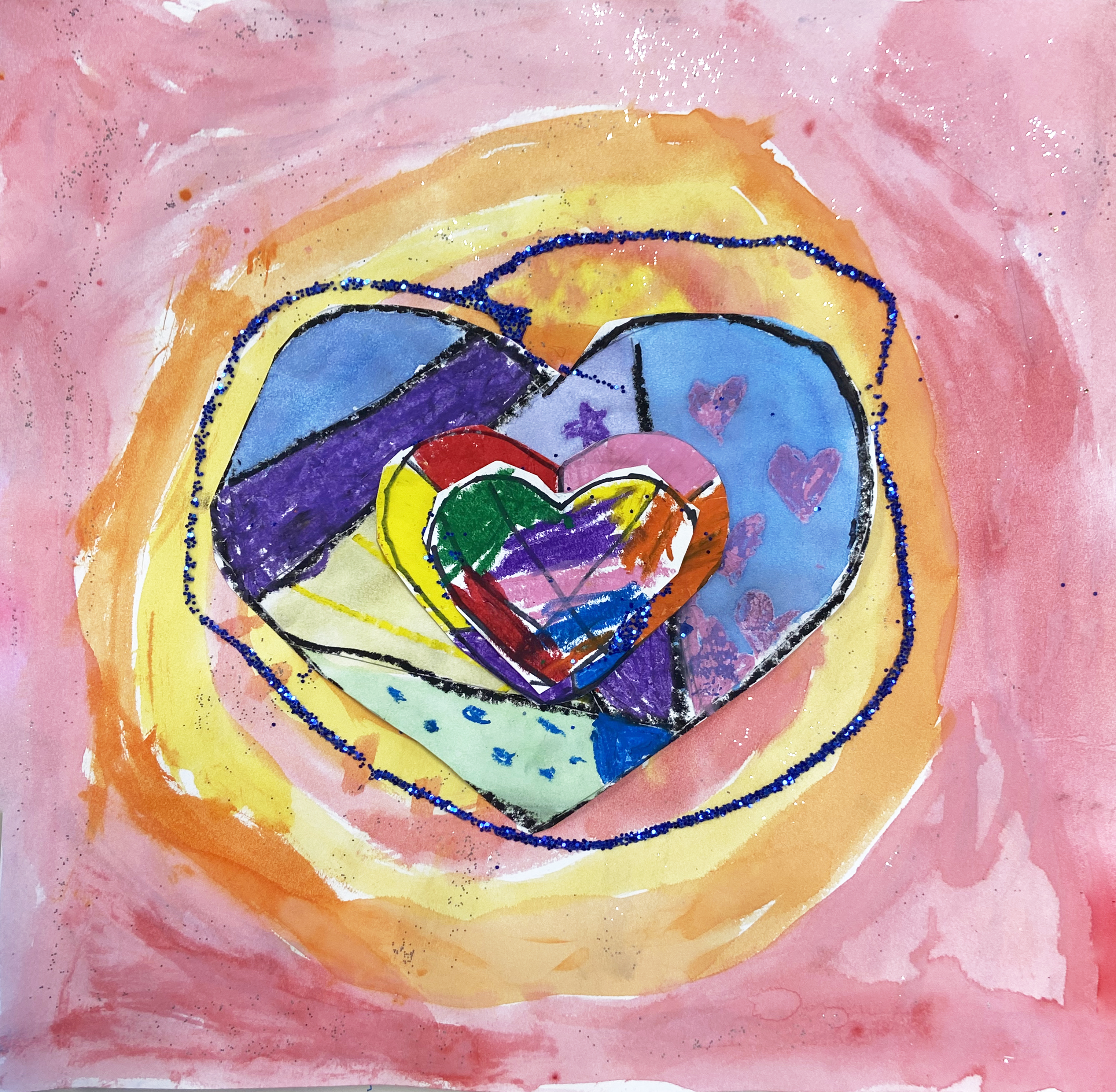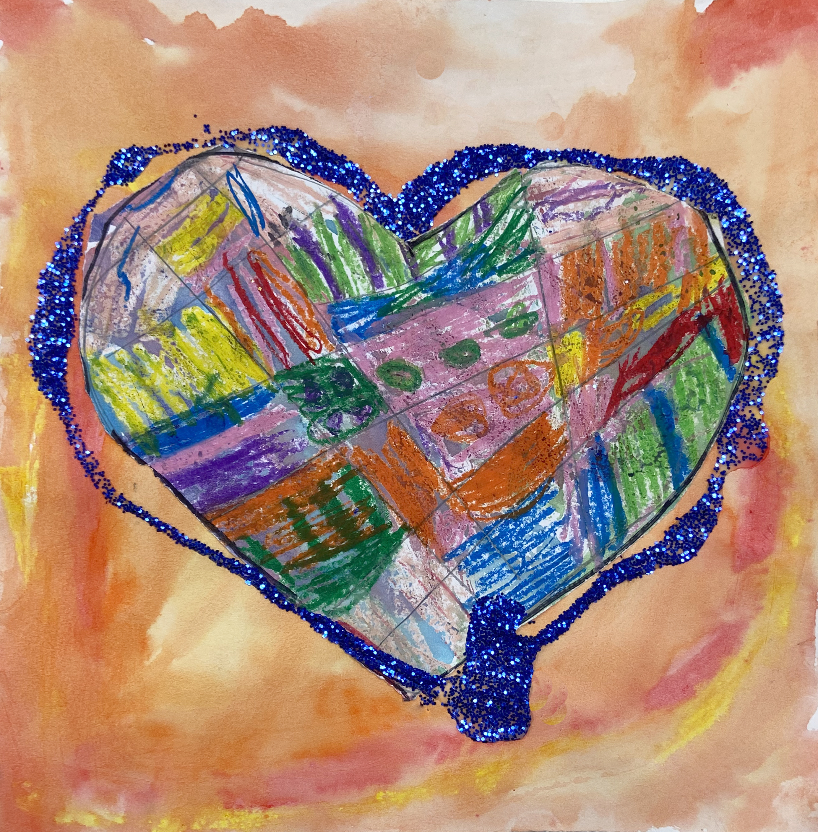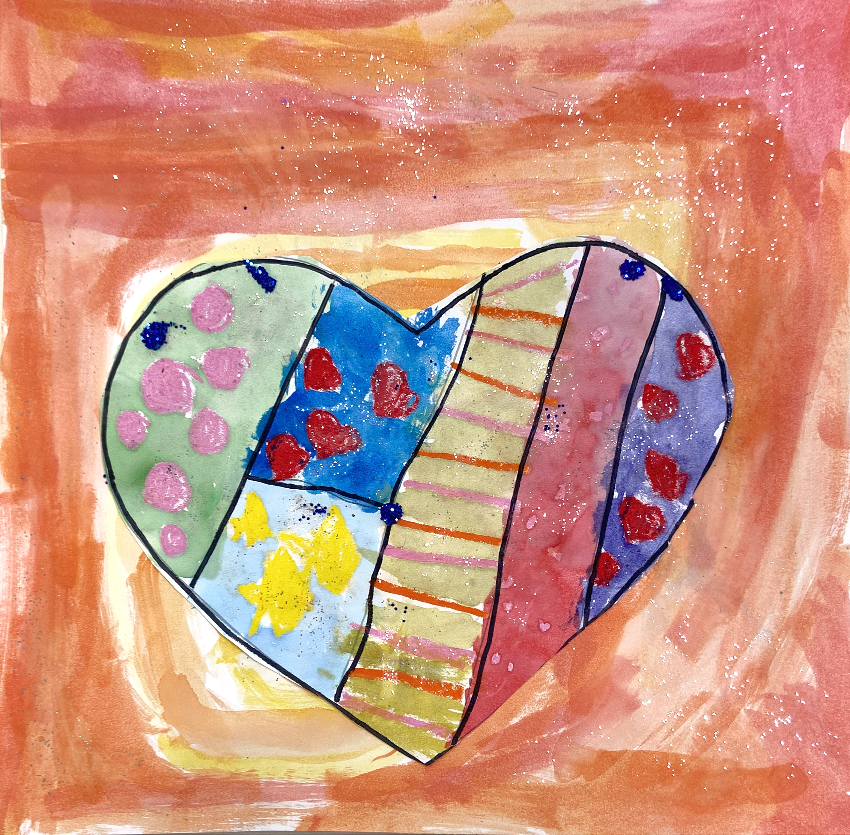 Students were introduced to the work by Romare Britto. In the spirit of Valentine’s Day, students created their own heart design using pattern and colors of their own choosing.