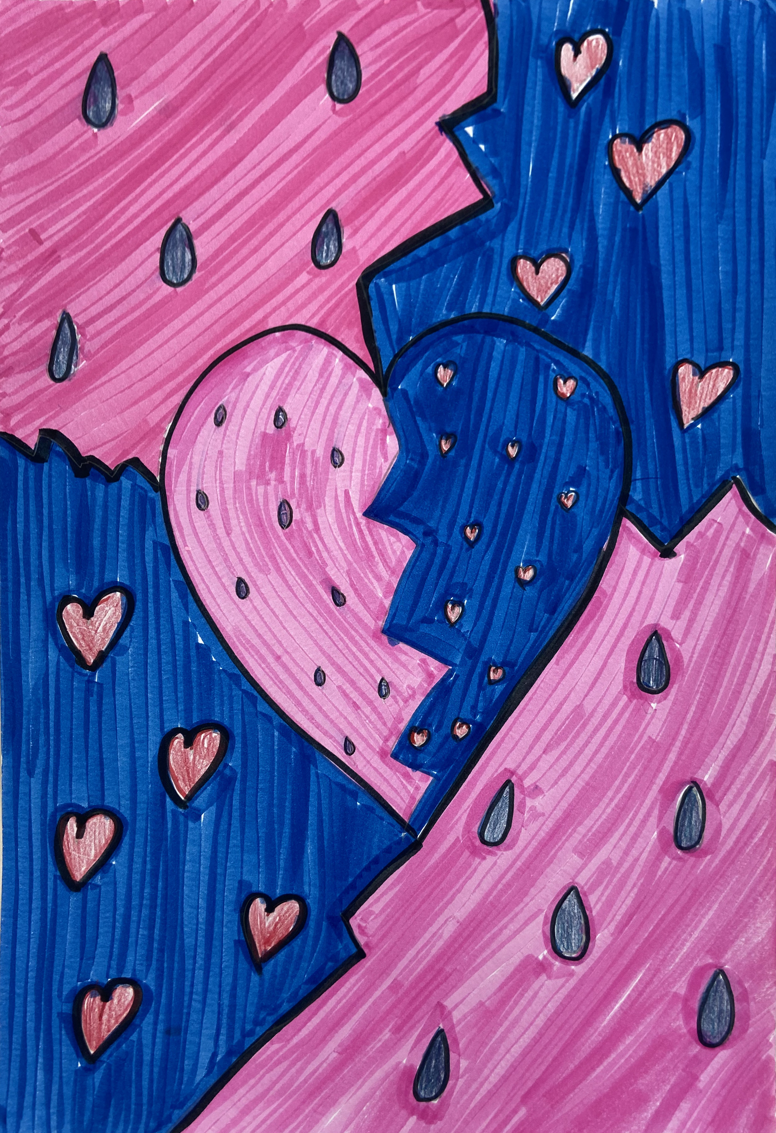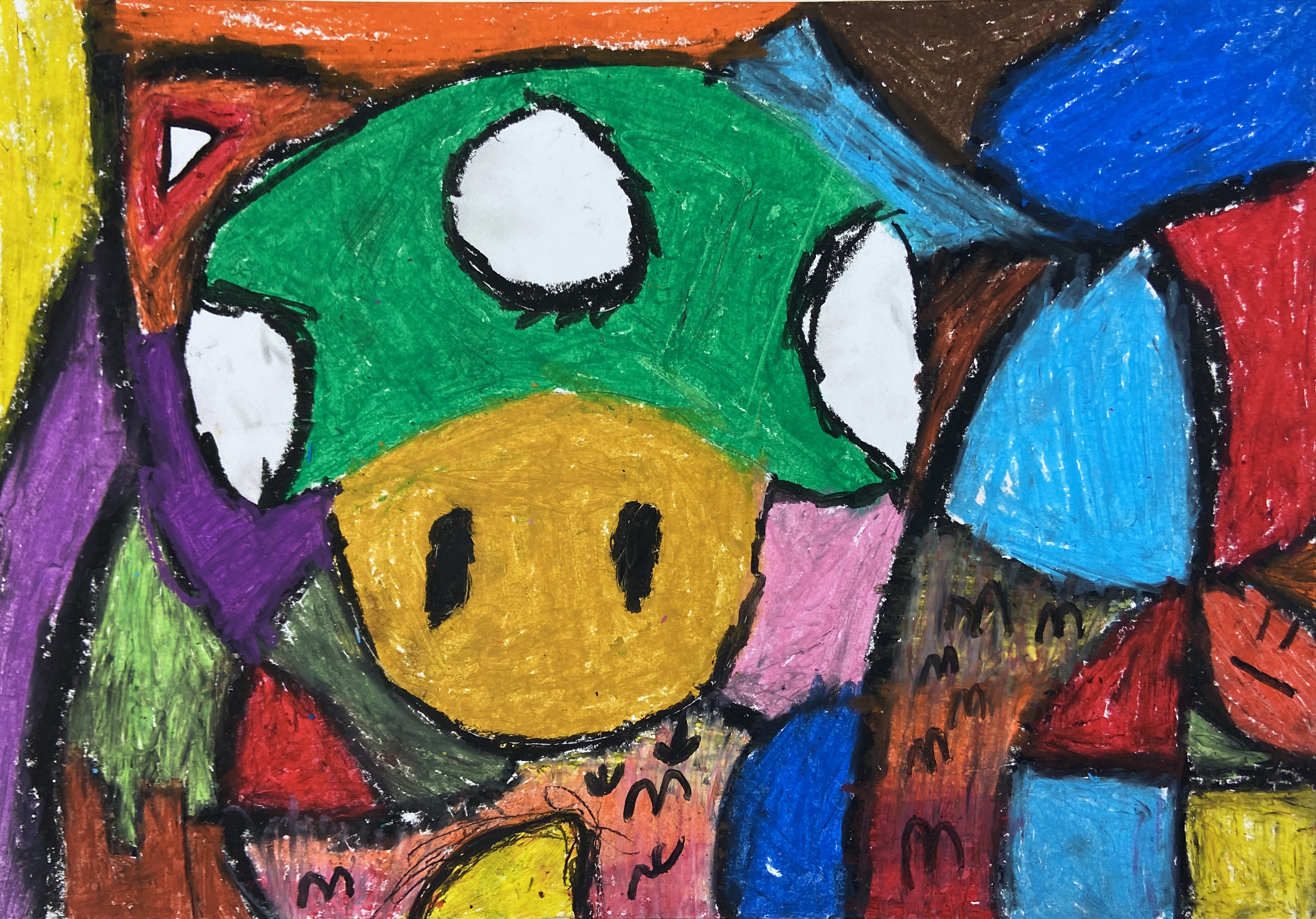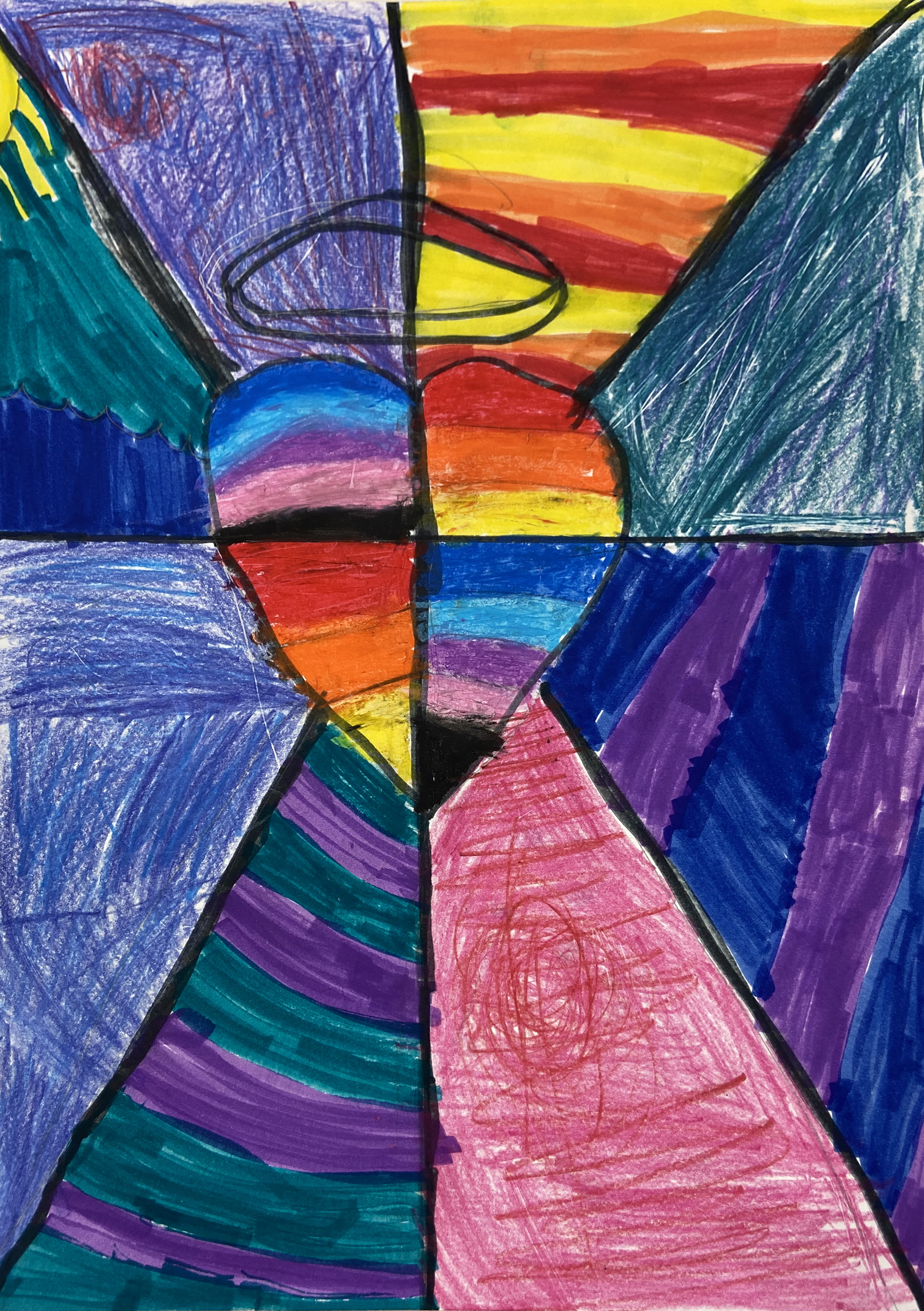 After exploring the work of Romero Britto, students came up with a composition of their own to color in a similar manner using bright shapes and patterns.