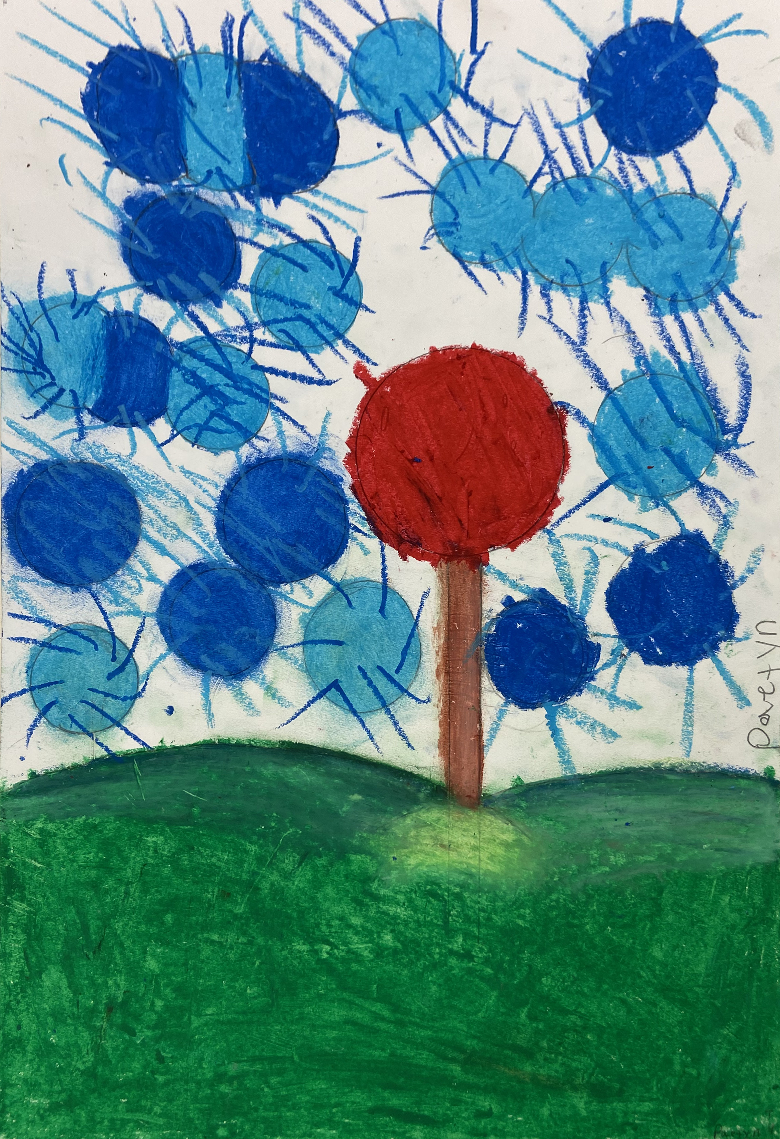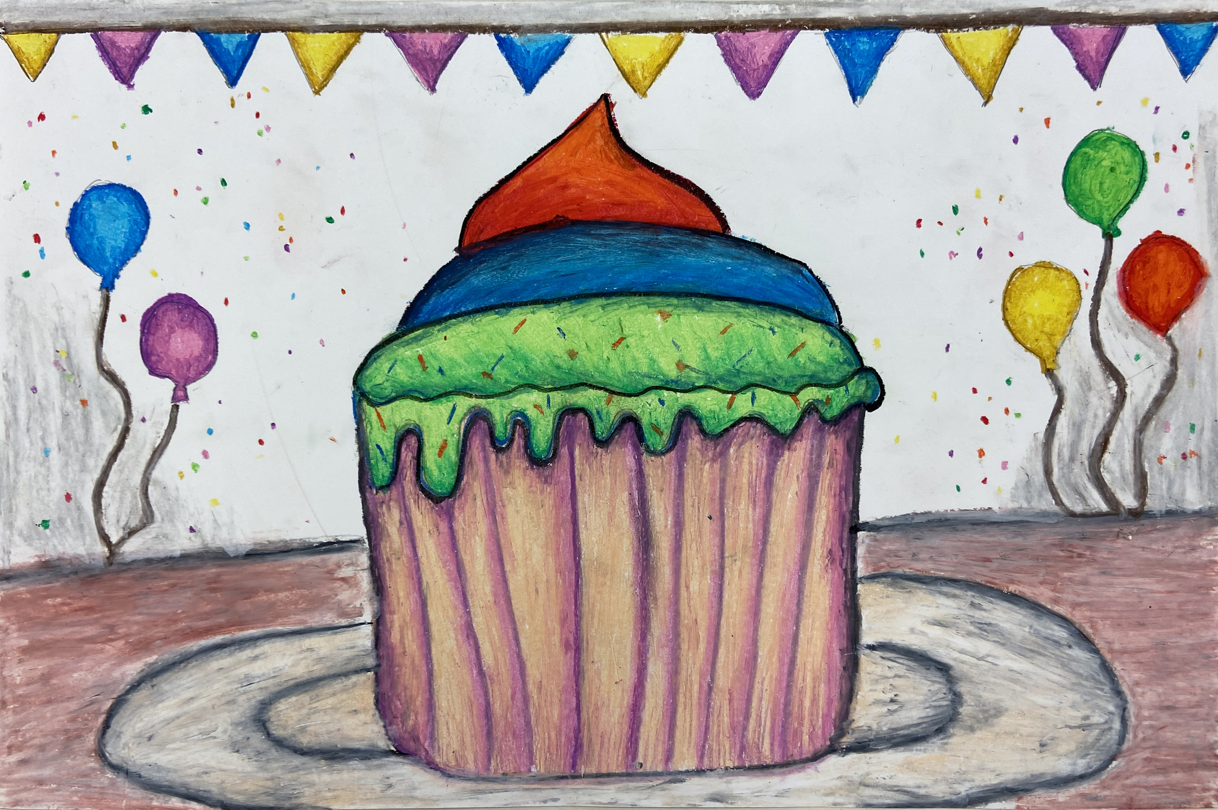 Students studied the work of Wayne Thiebaud and came up with their own version of a pop-art still-life. While some students chose food items, others chose makeup or other commonly used items. Students could choose from acrylic paint or oil pastel for the finished artwork.
