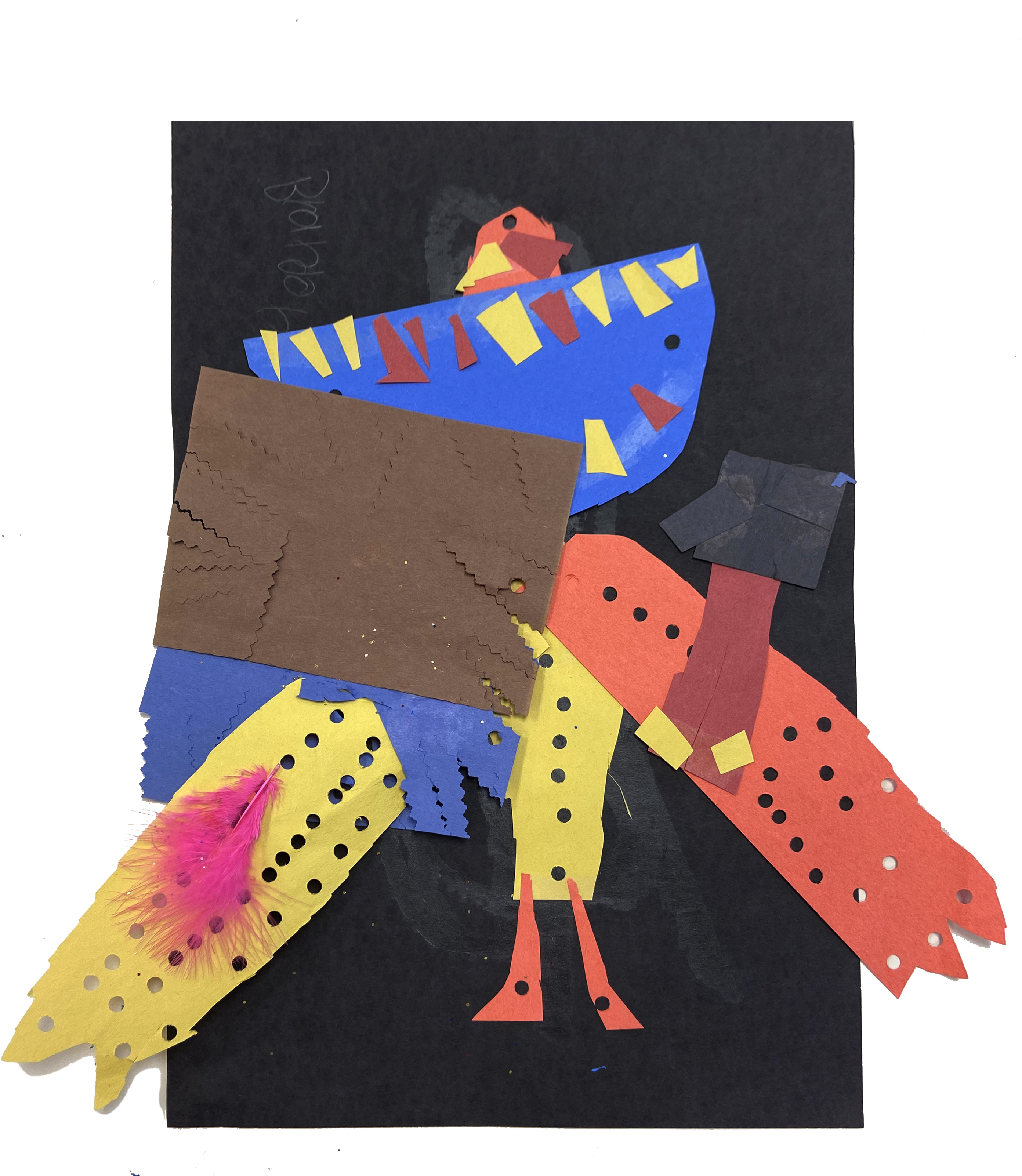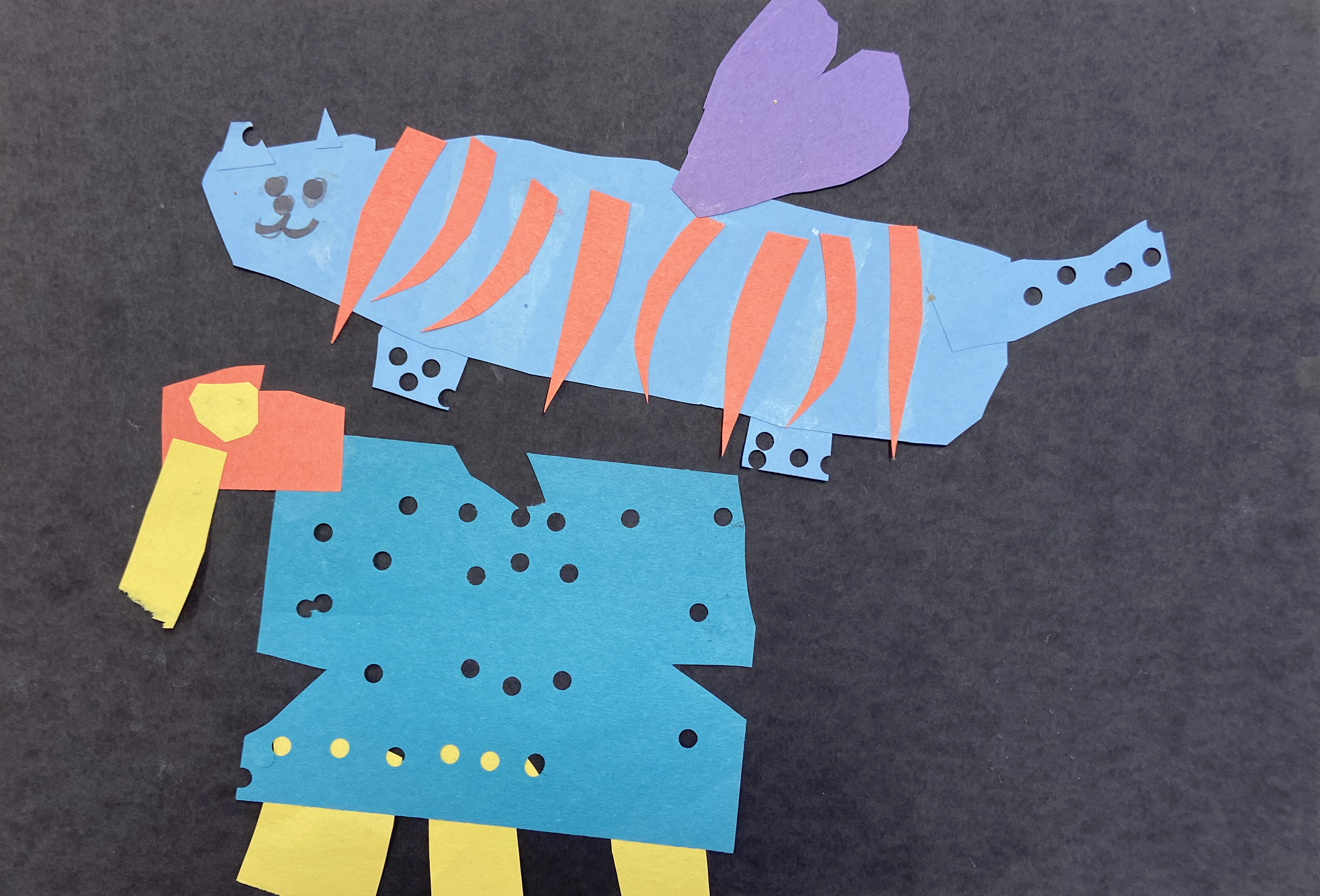 This lesson is part of a learning unit about the unique abilities of paper. Students drew inspiration from the book “If You’re a Monster and You Know It”, by Rebecca Emberley and Ed Emberley, to create their own monsters from cut paper. Students chose colors to represent the mood of their monsters. In the process of monster building students learned how to cut multiple objects at once and how to layer punched paper to create unique texture for their monster’s skin.