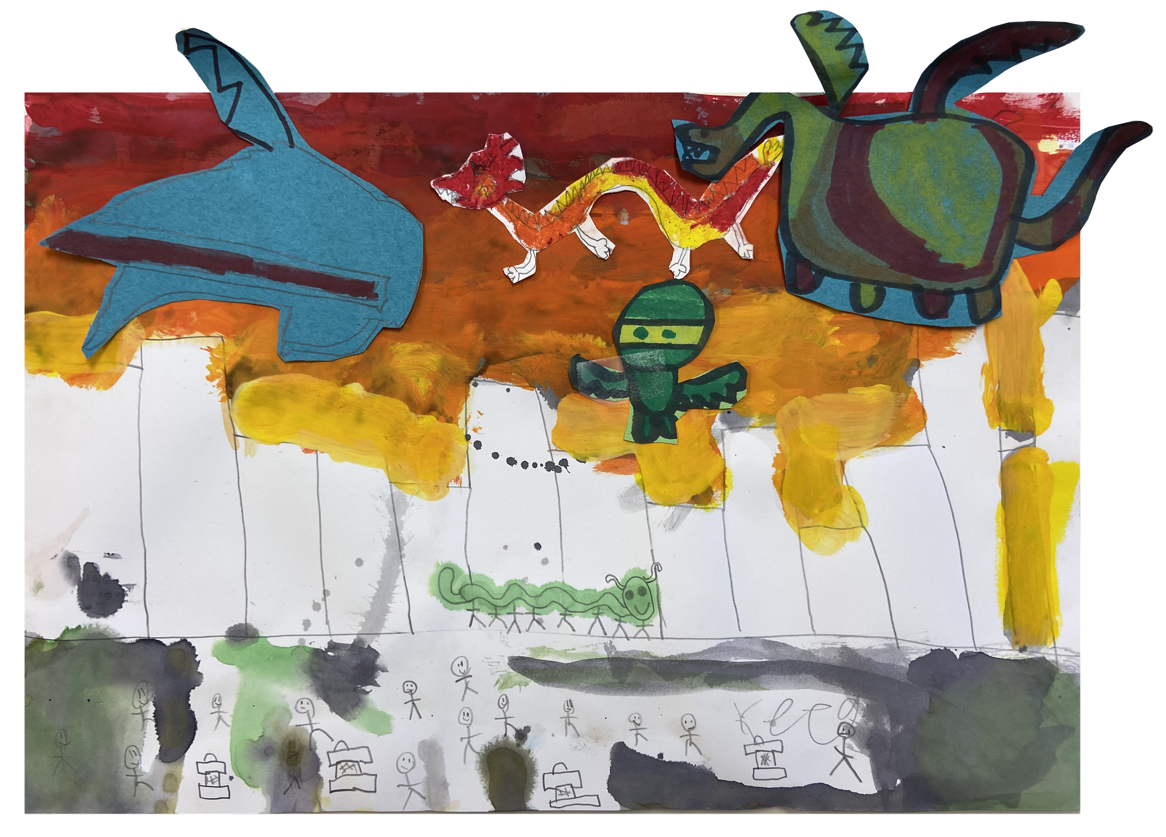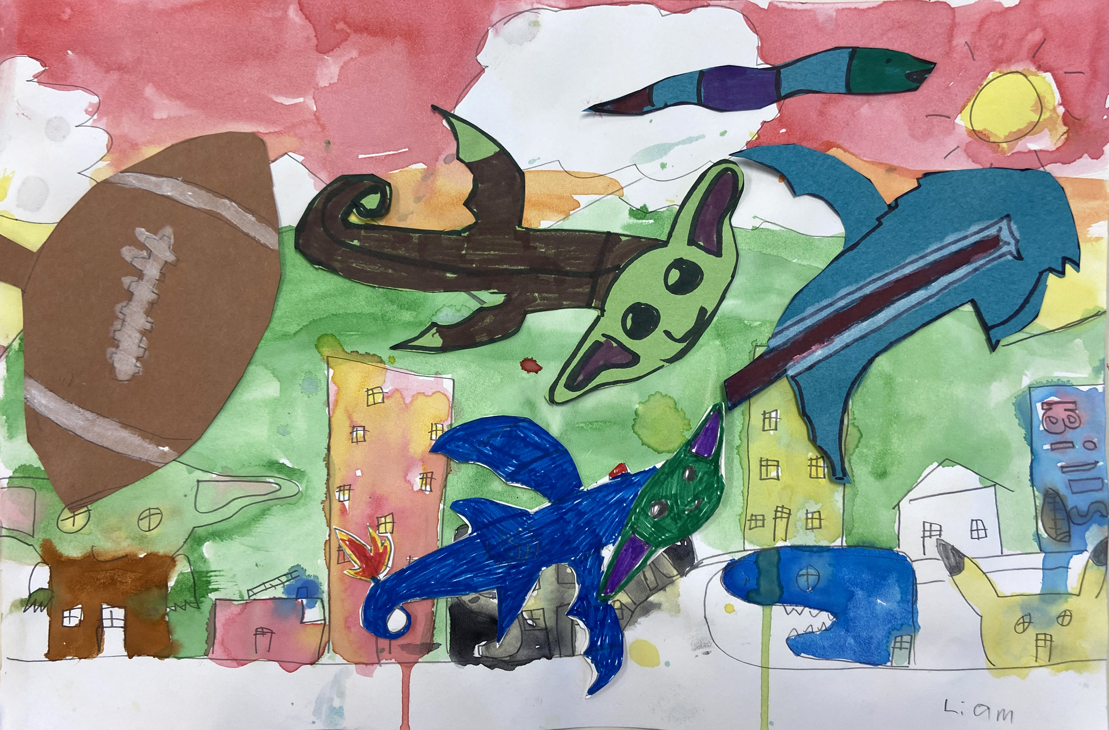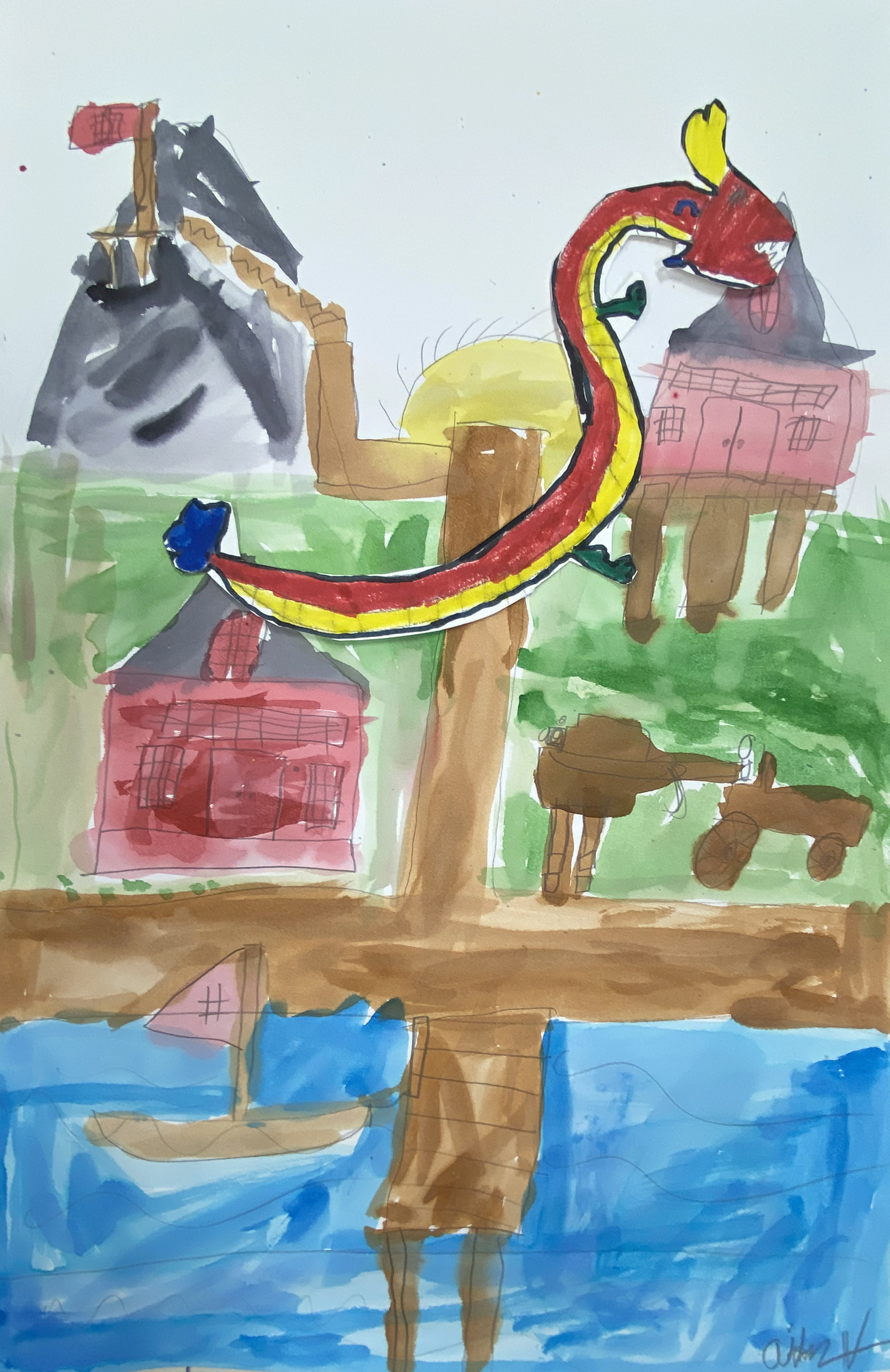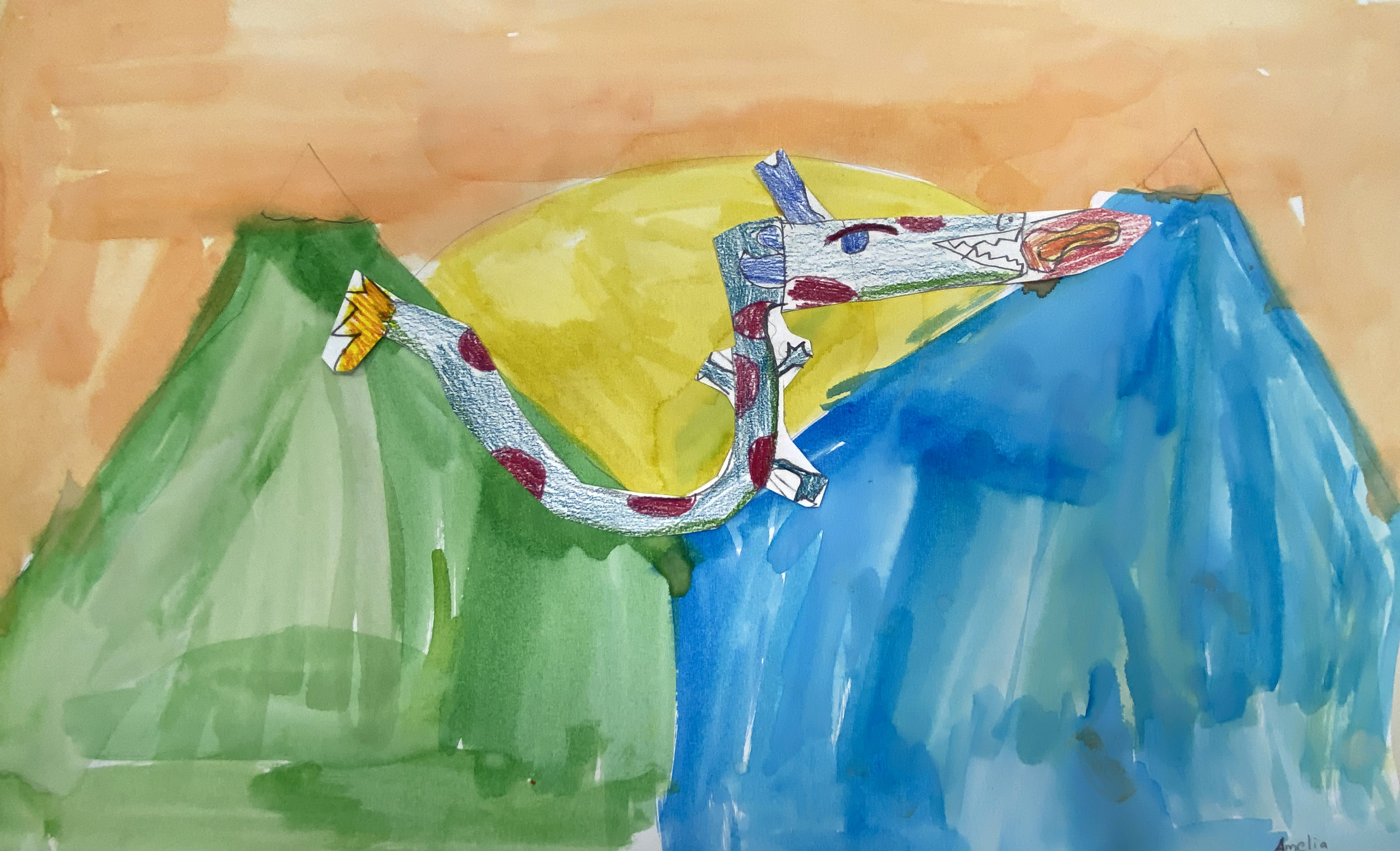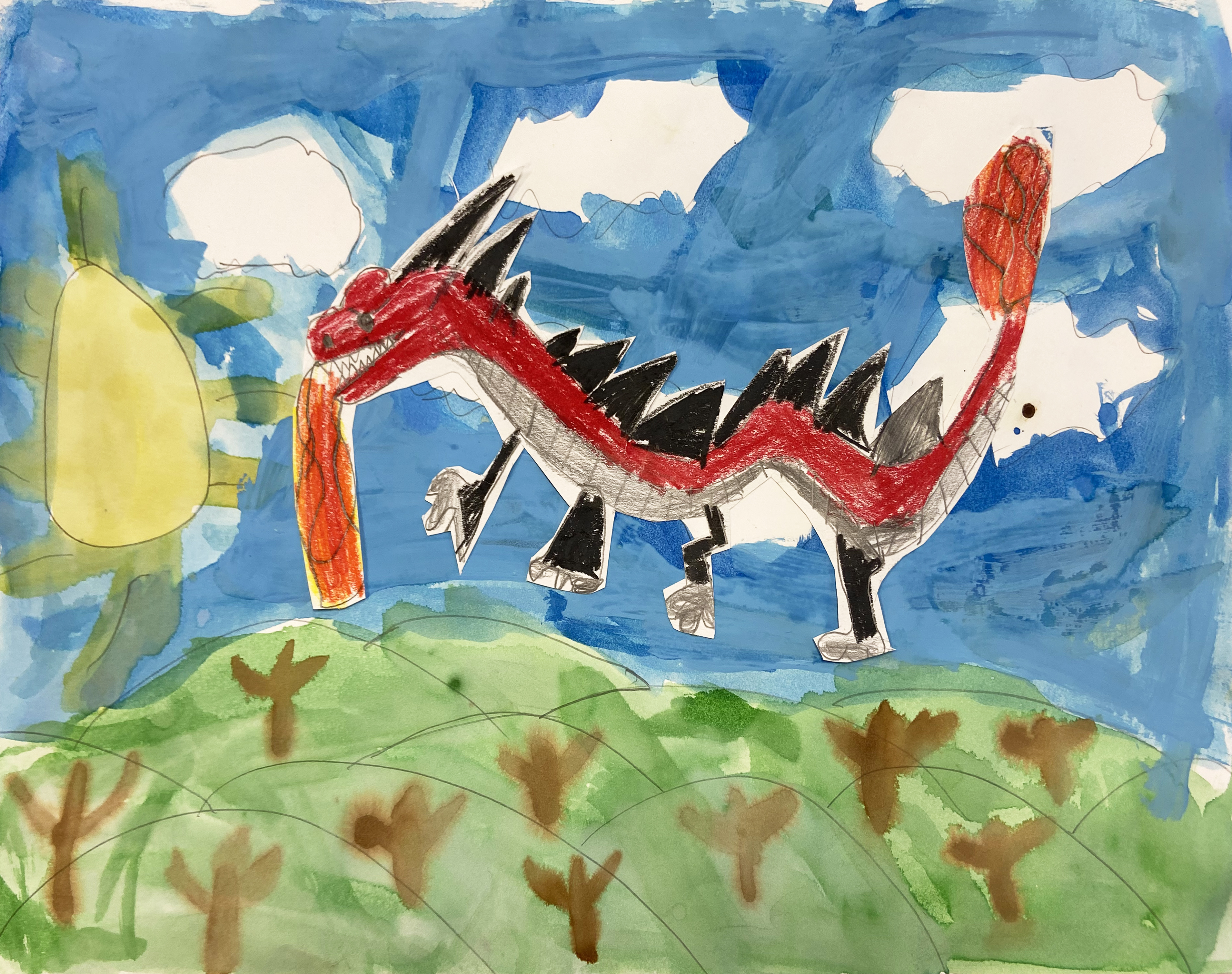 In celebration of Chinese New Year, students watched a YouTube read aloud from the book “Nian, the Chinese New Year Dragon” by Virginia Loh-Hagan, Illustrated by Timothy Banks. The book depicted the origins of Chinese New Year mythology through the story of Mei, a brave little girl, who outwitted a dangerous dragon. Students engaged in conversations about style choices the illustrator made, and what type of setting they could place their Chinese Dragon in. Some students imagined their dragons in a natural setting, like a mountain range or volcano. Others imagined their dragons as part of a celebration in a city, with other parade floats.