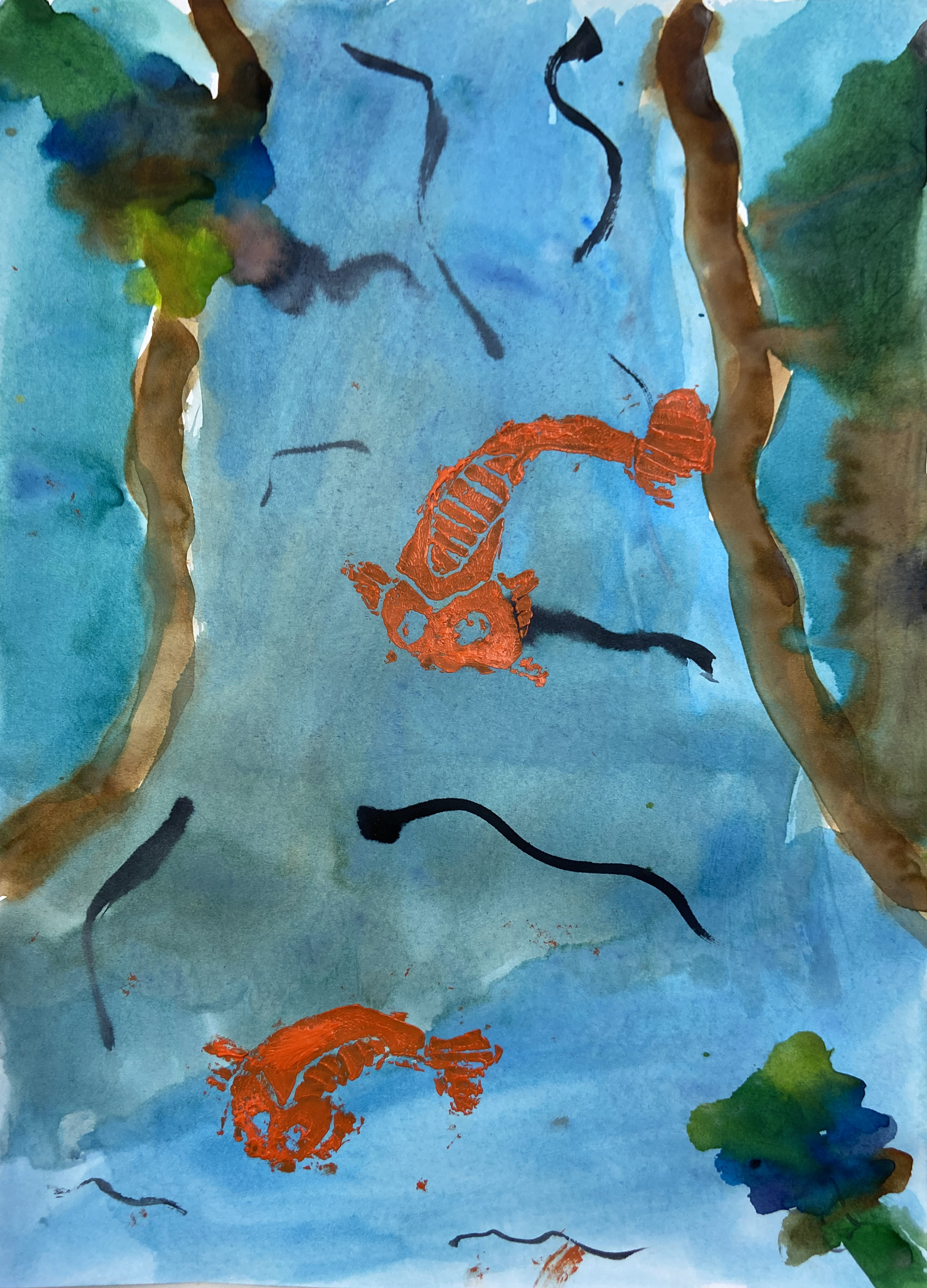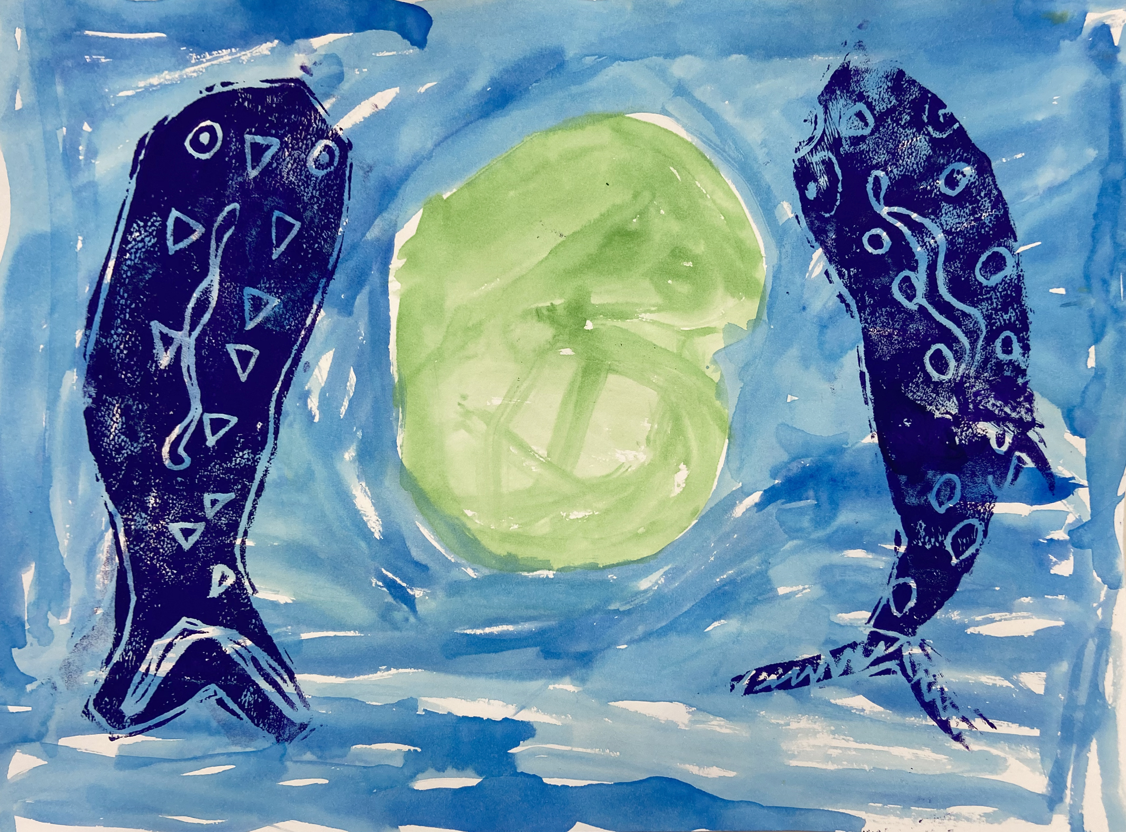 Students learned about the process of printing, and designed a koi pond of their own imagination. Using watercolor for the background, students used foam plates to print their koi fish onto their backgrounds.